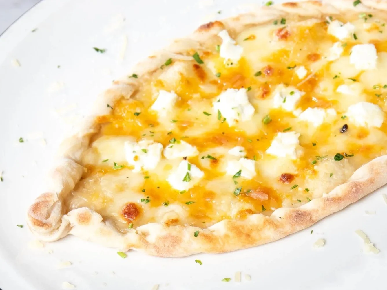 Fatayer topped with béchamel, mozzarella, feta, cheddar and Parmesan.