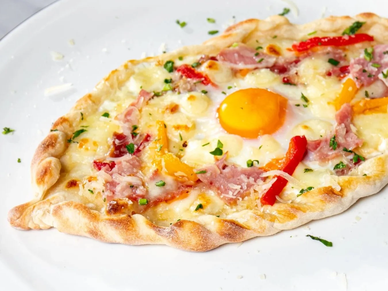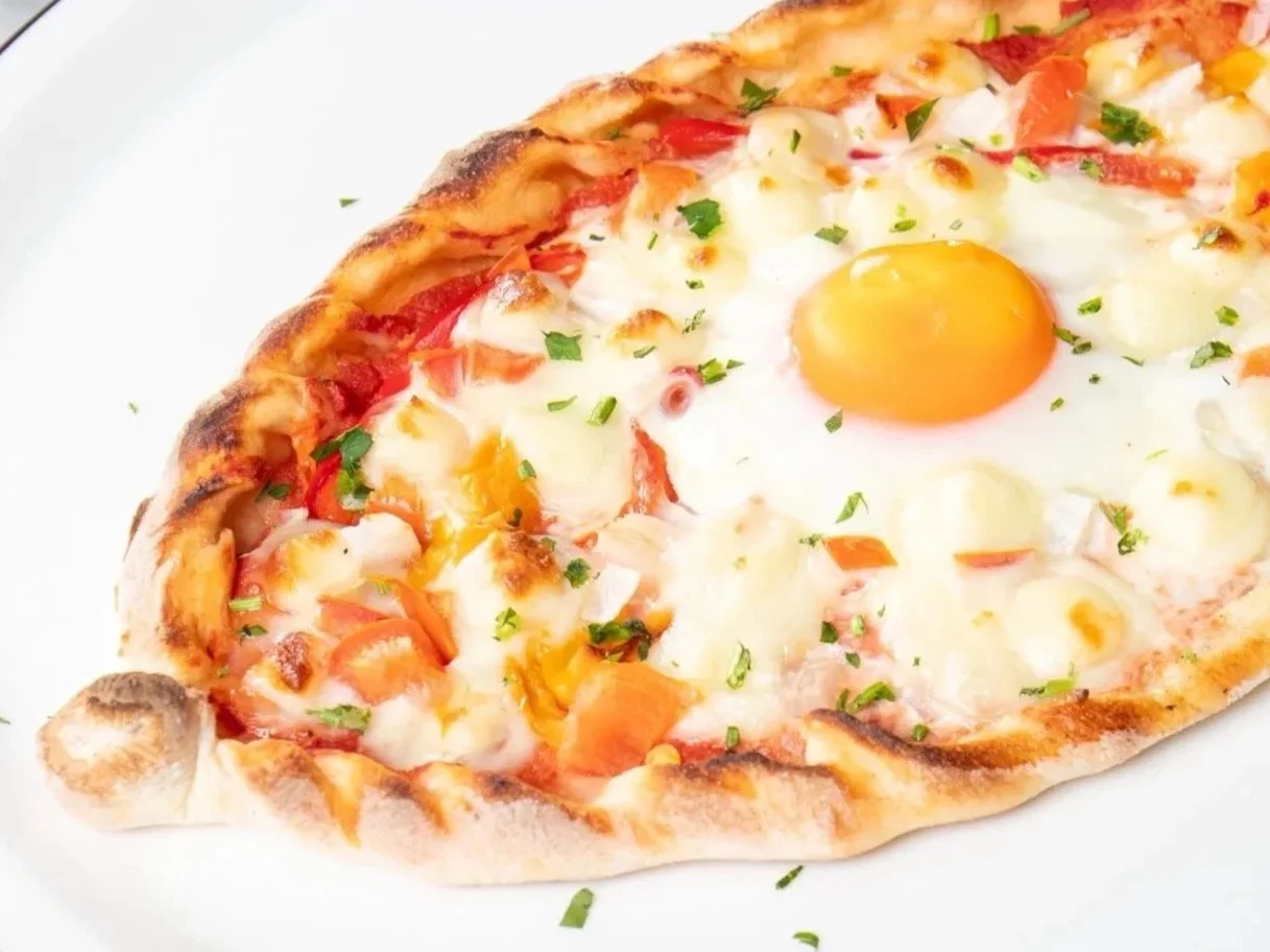 Gondola base with béchamel, veal bacon, roasted peppers, mozzarella, organic egg, finished with Parmesan and parsley.
