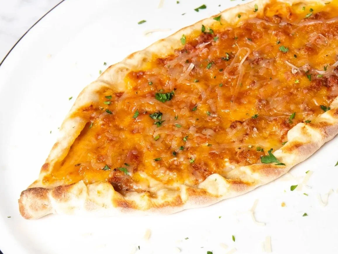 Baked fatayer with béchamel, Bolognese, cheddar, finished with Parmesan and parsley.