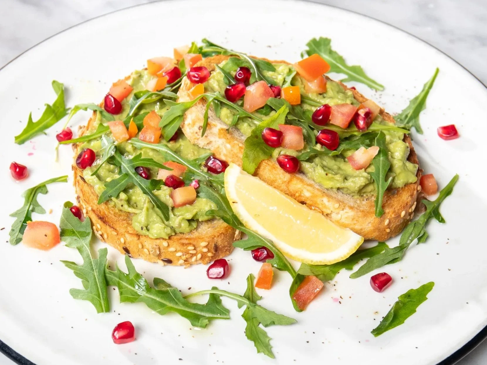 Mashed avocado on sourdough with pomegranate, tomato, rocket and olive oil drizzle