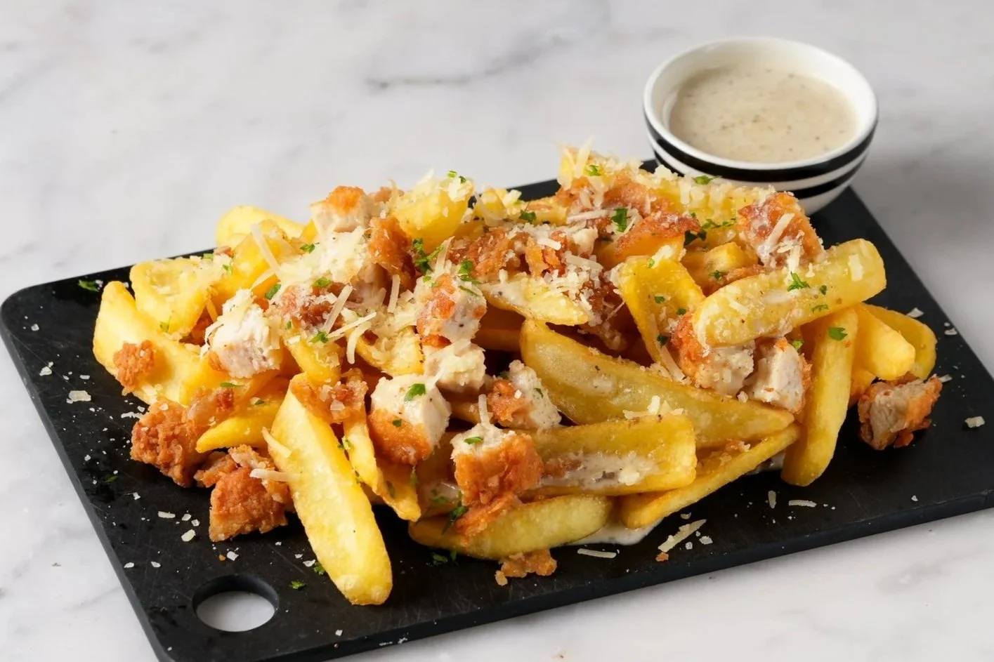 Potato dippers, cheesy truffle sauce, topped with chicken tenders and Parmesan.